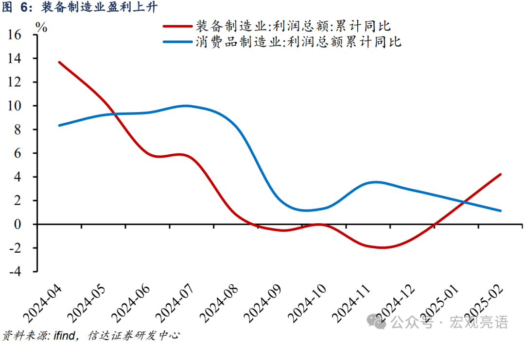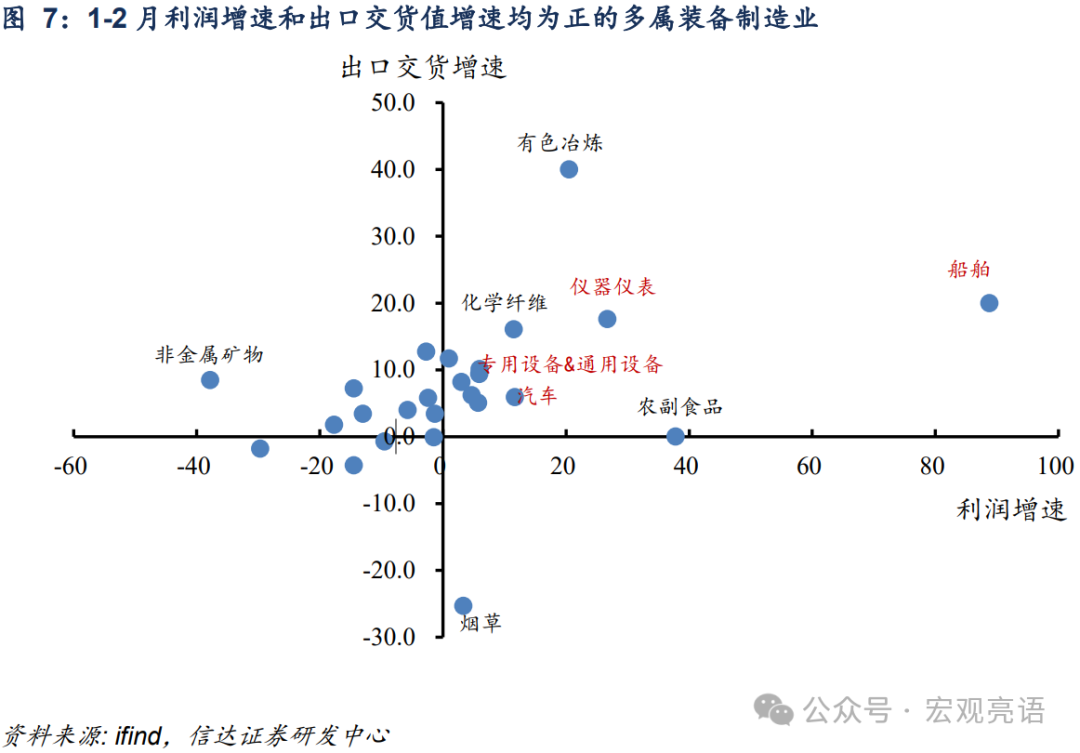 制约之二:盈利反弹的装备制造业企业又部分依赖出口。1-2月企业盈利改善的亮点在于,制造业企业利润增速由负转正。结合国家统计局的通稿来看,我们认为制造业企业盈利回正,主要是装备制造业和原材料制造业利润实现由负转正。而装备制造业细分行业的出口交货值增速均高于5%,其工业增加值增速多数为两位数增长,显示其一定程度上依赖了出口和海外需求。倘若后续出口风险提升,装备制造业企业盈利修复进程或将受到影响。我们认为企业利润增速想要获得稳步修复的前提是下游消费品制造业盈利也迎来改善。