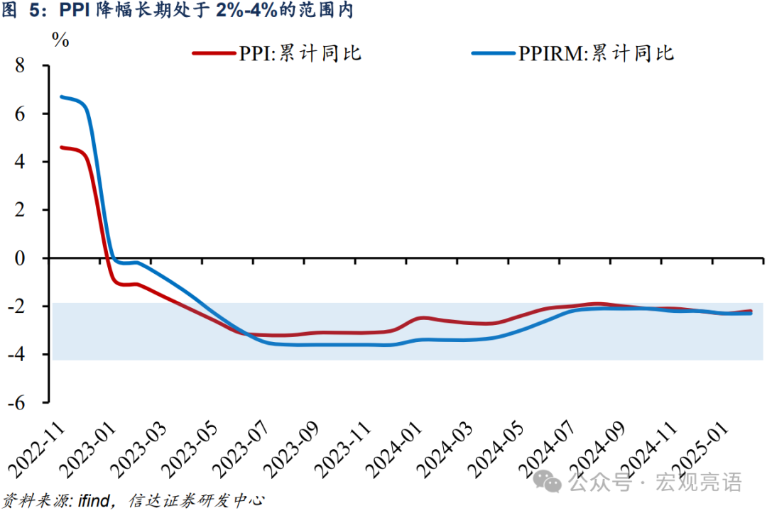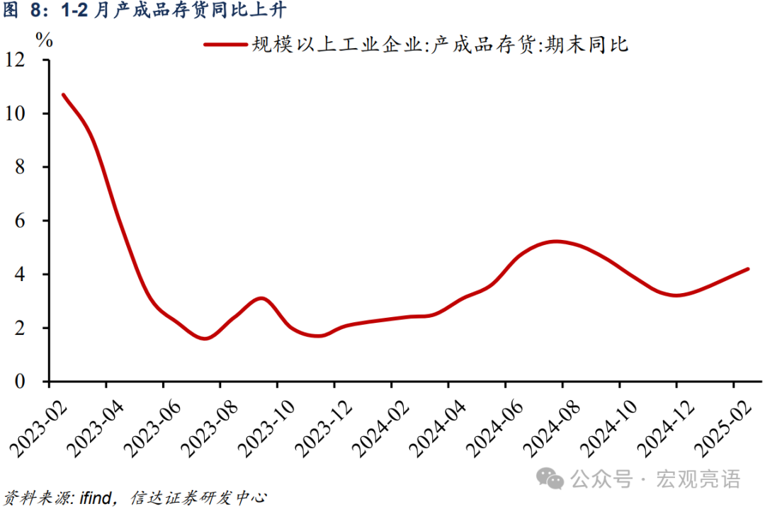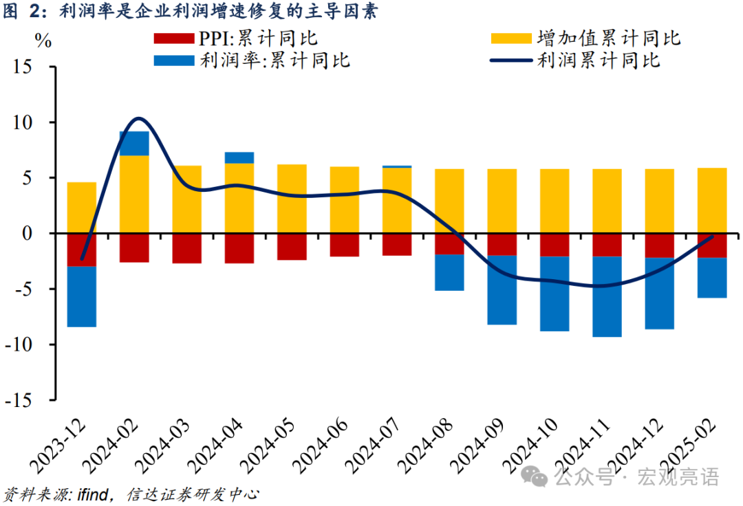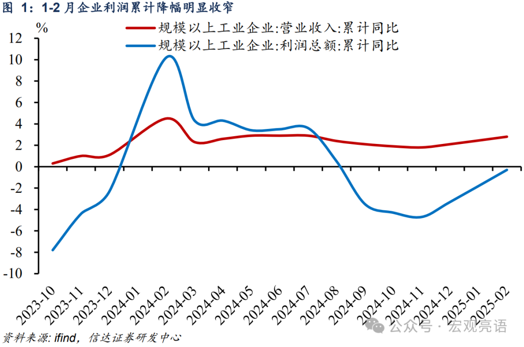 企业盈利降幅明显收窄,但增速尚未突破回正的临界点。从生产端角度看,2025年1-2月全国规模以上工业增加值同比增长5.9%,工业企业增加值同比继续提升;从价的角度看,1-2月的PPI累计同比-2.2%,与去年全年表现一致。量增让营收增速实现小幅回升,而企业利润率较去年同期差距缩小后,企业盈利降幅也明显收窄,较去年全年降幅收窄3个百分点。