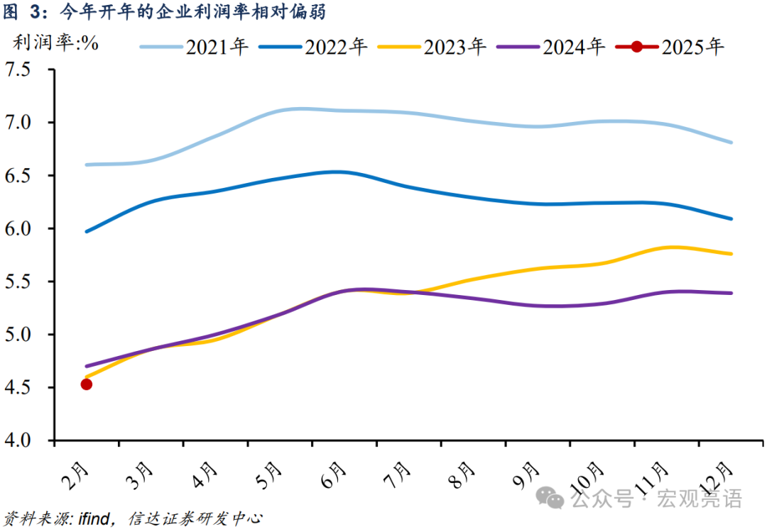2025年1-2月,全国规模以上工业企业利润总额同比下降0.3%,降幅较2024年全年收窄3.0个百分点(图1),显示盈利边际改善趋势。尽管工业企业全年营收利润率往往在1-2月出现低点,但4.53%的营收利润率是近几年以来同期的低位(图3),这意味着工业企业的盈利增长压力仍大,我们认为当前企业利润增速回正仍面临两重制约。(将在下文展开)