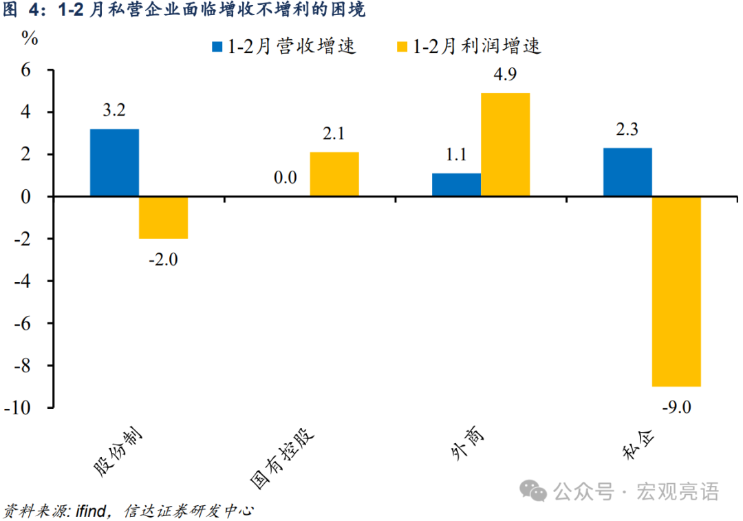 企业盈利未能回正的制约之一:是部分企业面临“增收不增利”的困境。根据国家统计局的公布来看,工业企业有股份制、国有控股、外商投资和私营企业四种类型,并且其营收增速均不低于零。然而,1—2月股份制企业利润同比下降2.0%,国有控股企业利润总额同比增长2.1%,外商及港澳台投资企业利润总额增长4.9%,私营企业利润总额下降9.0%(图4)。不难看出,股份制企业和私企都陷入了营收增长、利润下降的困境。